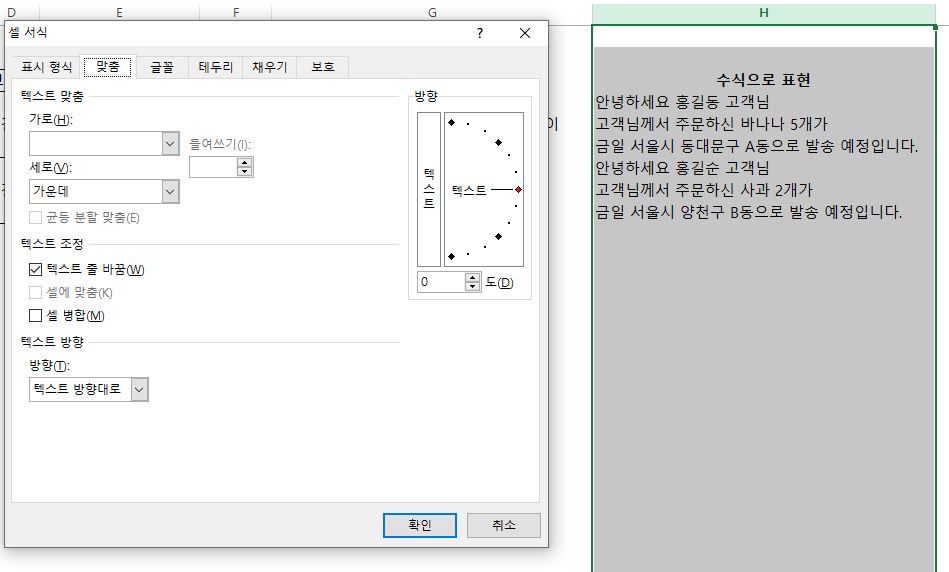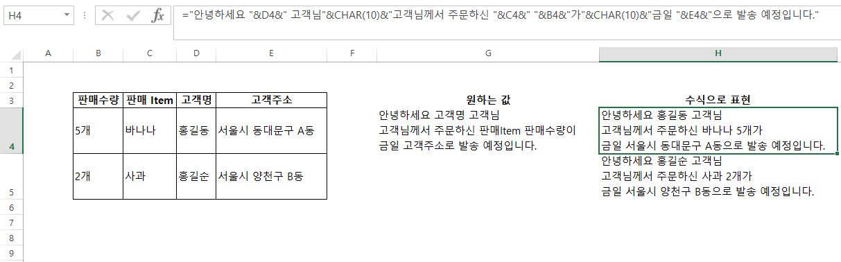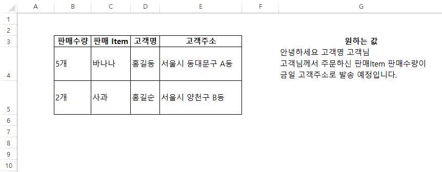 원하는 문구를 직접 기입해도 되지만 템플릿이 정해져있다면 원하는 문구도 셀의 값으로 변경하여