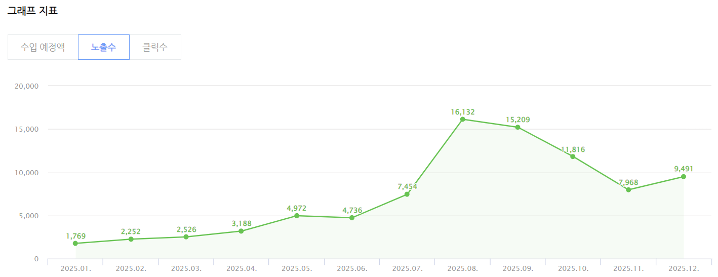 25년의 월별 애드포스트 수익입니다. 총 58,427원 밖에 되지 않지만