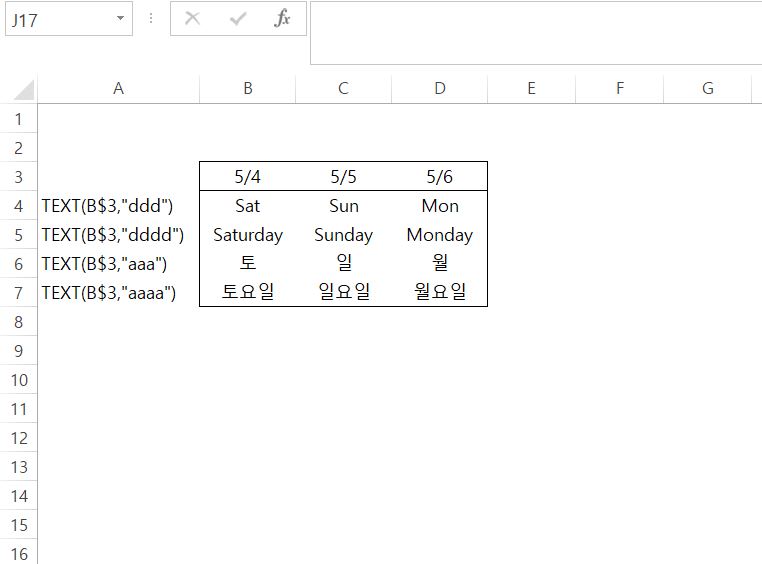 텍스트 함수를 이용하는 방법으로 A4부터 A7까지 양식을 그대로 사용해주면
