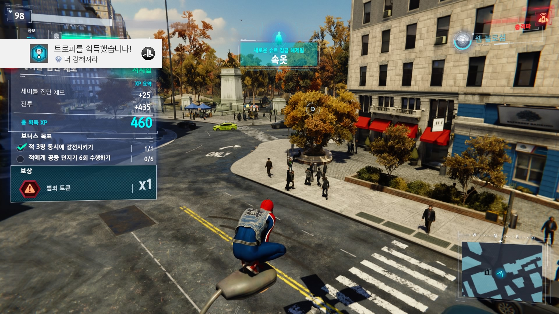 스파이더맨 같은 경우 스토리를 따라가다보면 대부분 트로피를 얻을 수 있기 때문에 조금만 더 하면